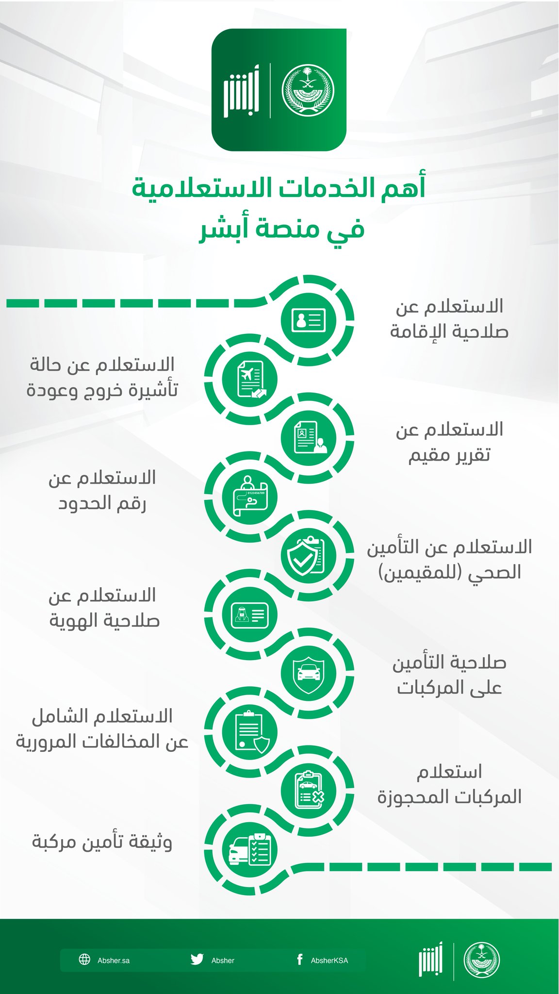 في خطوة تهدف إلى تطوير خدمات القطاعات بدأ المشاركون المتأهلون للمرحلة النهائية في تحدي أبشر الذي أعلنت عنه وزارة الداخلية اليوم الجمعة في تنفيذ الجزء العلمي الخاص بالفكرة والتي يتم تحكيمها من اللجنة يوم غد السبت. إختيار الخدمات العامة من القائمة العلوية. الجوازات السعودية أعلنت المديرية العام ة للجوازات اليوم الخميس أنه بإمكان أصحاب العمل إصدار هوية مقيم عبر منصة أبشر الإلكترونية ولمدة سنتين وفق ا لما أورده حسابها الرسمي على موقع التواصل الاجتماعي تويتر. القيام بالدخول إلى الموقع الرسمي للتأمينات الإجتماعية من هنا.