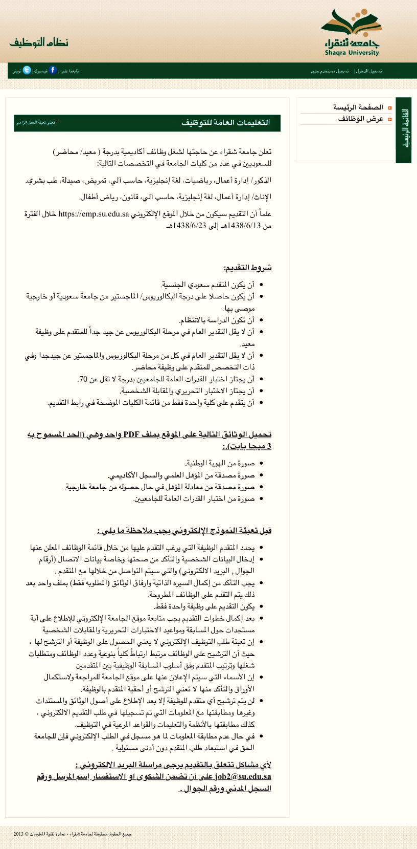 جامعة شقراء وظائف اكاديمية. تعلن جامعة شقراء. صحيفة جامعة شقراء المركز الاعلامي. أعلنت جامعة شقراء عن حاجتها لشغل عدد من الوظائف الأكاديمية للجنسين على درجة أستاذ مساعد أستاذ مشارك أستاذ. أعلنت جامعة شقراء عن حاجتها لشغل عدد من الوظائف الأكاديمية للجنسين على درجة أستاذ مساعد أستاذ مشارك أستاذ باشتراط أن يكون المتقدم أو المتقدمة سعودي سعودية الجنسية وأن يكون حاصلا على شهادة الدكتوراه أو ما.